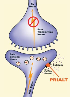 In the spinal fluid the Prialt molecules block pores on pain sensing nerve cells, which stops the flow of calcium into the cells. This reduction of calcium flow prevents the nerve cells from sending signals to the brain, reducing the perception of pain.