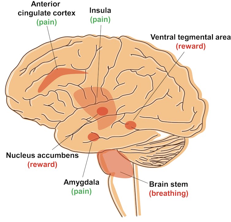 Which part of the brain is activated plays a vital role in controlling pain. For example, MORs are also present in the brain stem, a region that controls breathing. Activating these mu receptors, not only dulls pain but also slows breathing. Large doses stop breathing, causing death. Activating MORs in other parts of the brain, including the ventral tegmental area and the nucleus accumbens, block pain and trigger pleasure or reward, which makes them addictive. But so far there is no efficient way to turn these receptors “on” and “off” in specific areas.